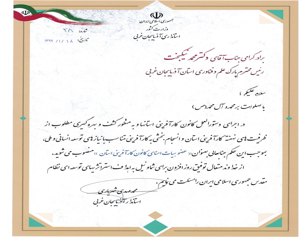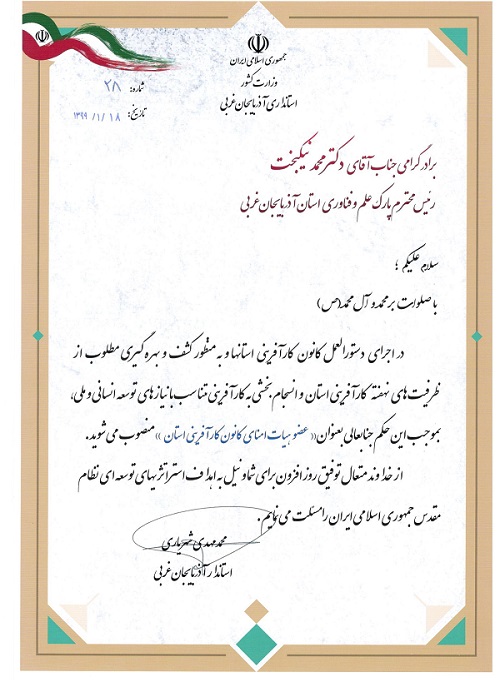 به گزارش روابط عمومی پارک علم و فناوری آذربایجان غربی، متن حکم به شرح ذیل می باشد:
