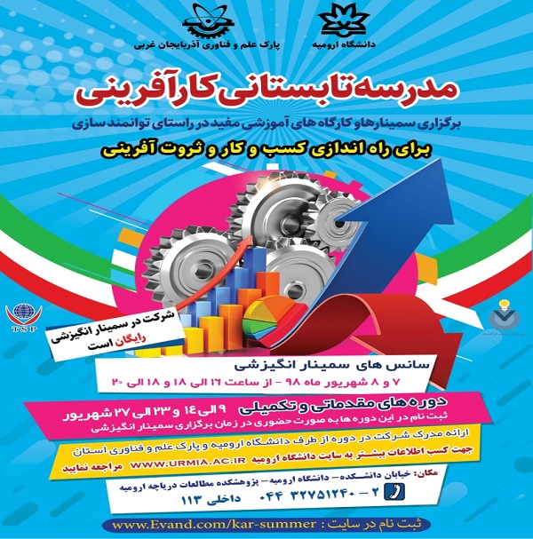 مدرسه تابستانی کارآفرینی با مشارکت پارک علم و فناوری آذربایجان غربی و مدیریت کارآفرینی و ارتباط با صنعت دانشگاه ارومیه برگزار می‌شود.